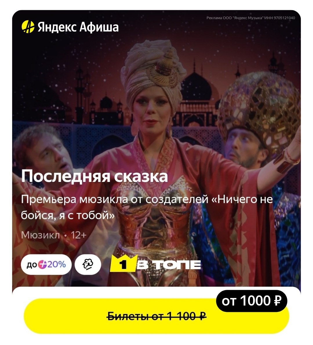 ⭐️ Мировая премьера мюзикла «Последняя сказка» Билеты по ссылке на Яндекс Афише ✨ Со скидкой выгоднее: ◆ C00397 — скидка 500 ₽ на первую и все повторные покупки билетов от 3000 ₽ ◆ AX5681 — скидка 10% на первую и все повторные покупки от 3 000 ₽ ◆ B32304 — скидка 300 ₽ на первую покупку билетов от 2000 ₽ ◆ A21138 — скидка 100 ₽ на все повторные покупки билетов от 1000 ₽ ◆ AW423018 — скидка 750 ₽ от 5 000 ₽ для новых пользователей Не действует на подарочные сертификаты, билеты в кино и при оплате Пушкинской картой. Не суммируется с акциями, картой лояльности и специальными предложениями. Реклама. ООО "ЯНДЕКС МУЗЫКА", ИНН 9705121040. erid: 2VtzqvwzhbX