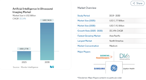Рынок искусственного интеллекта в ультразвуковой визуализации переживает период стремительного роста и трансформации. По данным нового отчета Mordor Intelligence, объем рынка ИИ в УЗИ уже в этом году достигнет 1,77 млрд долларов США, а к 2030 году увеличится до 7,41 млрд долларов! То есть, в среднем в год рынок будет расти на 33,14% (этот показатель – один из самых высоких показателей в сегменте медицинских технологий). Почему рынок растет так быстро? Мировой переход от оператор-зависимых методик к программно-определяемым алгоритмам становится одним из ключевых драйверов роста. ИИ все чаще встраивается в рабочие процессы, помогая стандартизировать качество УЗИ-изображений и повышать точность результатов. Миниатюризация ультразвуковых датчиков делает портативные и зондовые устройства доступными для первичной помощи. Уточненные регуляторные рамки сокращают цикл коммерциализации, а крупные производители активно выкупают ИИ-стартапы, формируя экосистемы для «полнофункциональных ИИ-платфор