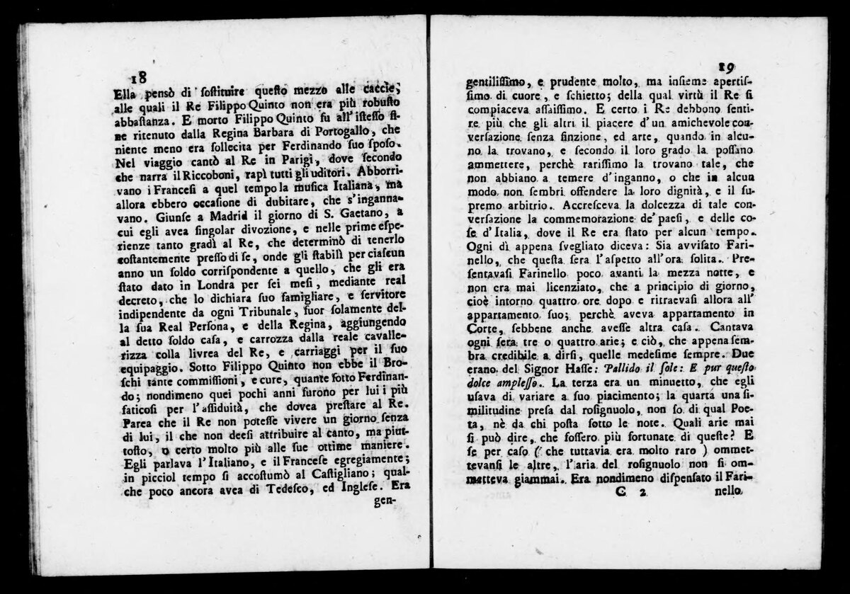 В биографии «Vita del Cavaliere Don Carlo Broschi» (1784) Джовенале Сакки описаны обязанности певца Карло Броски (Фаринелли) при дворе