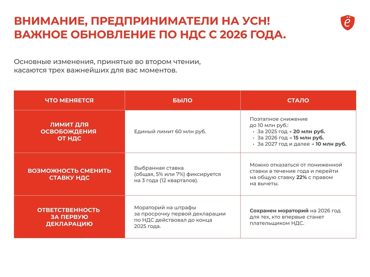 📣Внимание, предприниматели на УСН! Госдума одобрила во втором чтении ключевые поправки в Налоговый кодекс. Рассказываем кратко и по делу, что ждать бизнесу, который теряет освобождение от НДС. ✅ Что окончательно решили депутаты Основные изменения, принятые во втором чтении, касаются трех важнейших для вас моментов, которые мы показали в табличке. 🗓️ Что ждет закон дальше · Третье чтение запланировано на 20 ноября 2025 года. Ожидается, что оно будет формальным, и кардинальных изменений в принятые поправки не последует. · После этого закон будет направлен на подпись Президенту и вступит в силу с 1 января 2026 года. Поставьте лайк этому посту, если хотите быть в курсе итоговых результатов законопроекта после третьего чтения! ❤️