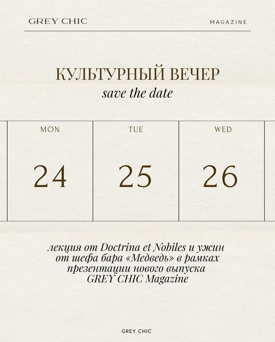 Активно готовимся к культурному вечеру с лекцией от Doctrina et Nobiles и ужином от шефа бара «Медведь» в рамках презентации нового выпуска GREY CHIC Magazine. В карточках читайте более подробную программу предстоящего события, а в конце вас ждет информация о той части вечера, которую мы держали в небольшом секрете. 🍸 Успевайте приобретать билеты и увидимся совсем скоро! GREY CHIC