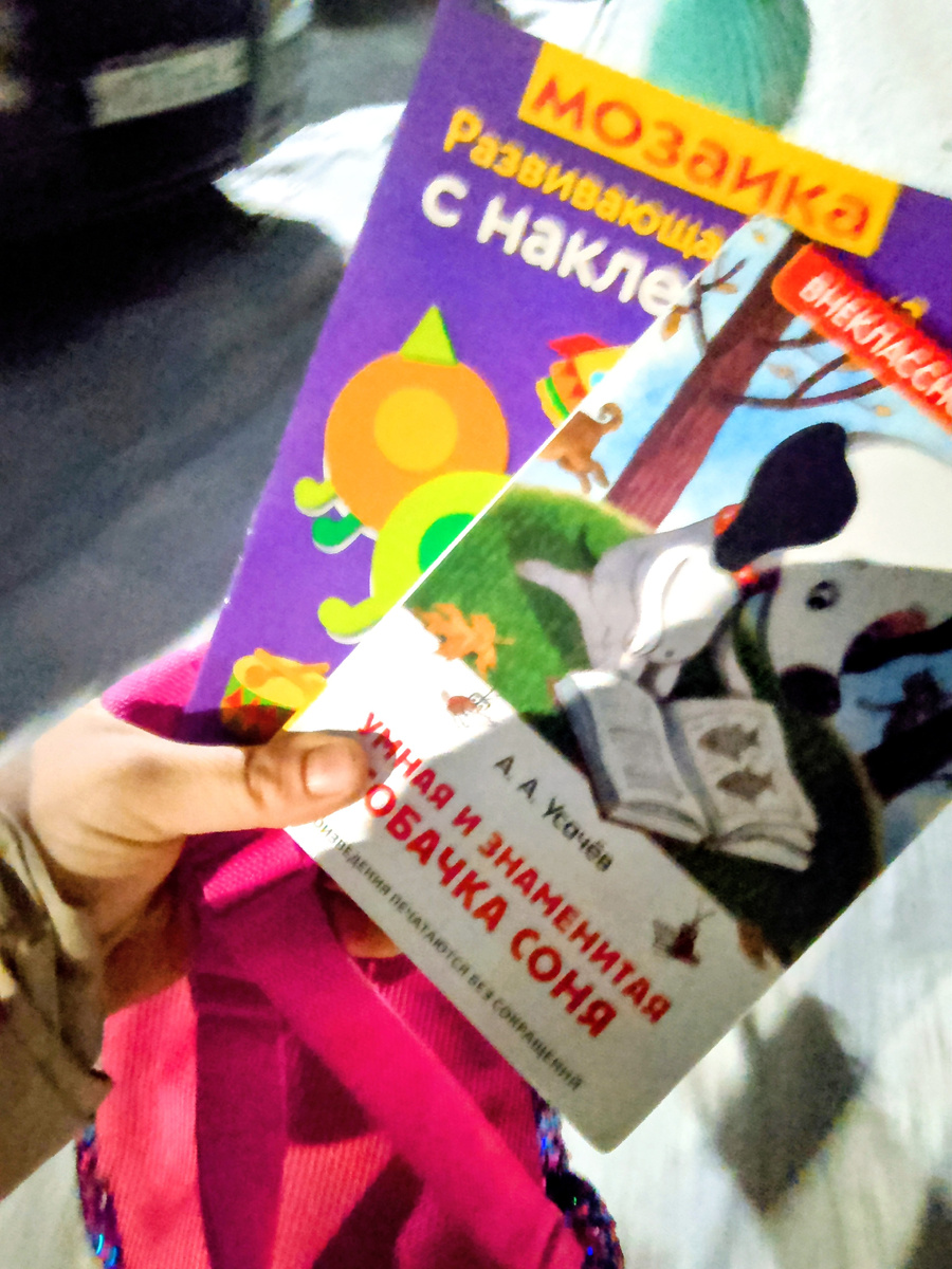 А в сад с пустыми руками мы не ходим, сегодня дочка выбрала взять с собой книжку им воспитатели в обед или перед сном читают, занимашку ещё и лопатку для снега с собой взяла а то говорит на прогулке ей не хватает лопатки