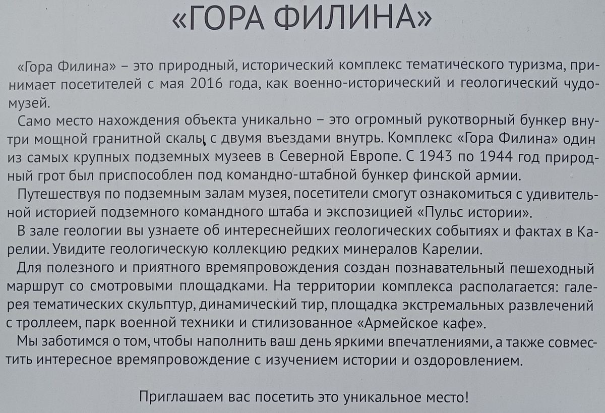 (Окончание. Начало здесь: https://dzen.ru/b/aR0zj8qXI3M0FZjK). Второй очень интересный, достойный посещения объект в Лахденпохье – это так называемая «Гора Филиниа», или по-фински Хуухканмяки. Это небольшая скала, внутри которой финны оборудовали бункер-укрытие, а рядом построили военный городок. Он сохранялся долгое время и в советскую эпоху, до 1980-х годов, когда здесь около полутора месяцев проходил военные сборы студент юрфака СПбГУ Дмитрий Медведев. Ведь Лахденпохья находится в приграничной зоне, всего в 20-30 км от границы с Финляндией, и тогда тут действовал пропускной режим. (Хотя, как и в Выборге, и сейчас могут попросить предъявить паспорт). Еще в 1930-40-х годах Ладожское озеро (по-фински Лаатокка) было пограничным и являлось местом морских (точней – озерных) боев. В послевоенное время в Лахденпохье базировалась советская Ладожская флотилия, в которой были небольшие подводные лодки. Сегодня в это даже трудно поверить. Как и в то, что военную базу финнов Хуухканмяки посе