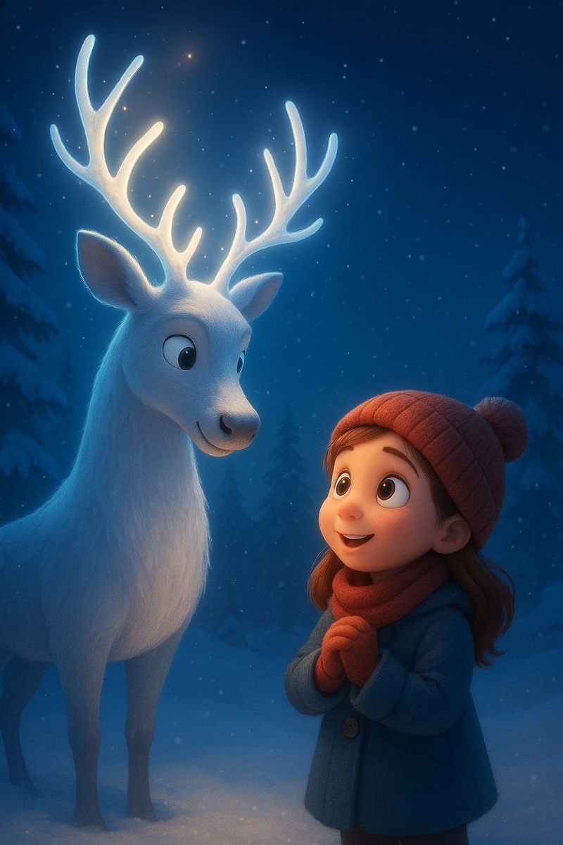 Сказка «Рождественское чудо в лесу» В канун Рождества в маленькой деревушке, где снежинки кружились так нежно, будто танцевали свой зимний вальс, жила девочка по имени Катрин. Она обожала зиму — особенно её тихие вечера, когда в окнах домов загорались тёплые огоньки, а воздух наполнялся запахом выпечки и ожиданием чуда. Но в это Рождество Катрин грустила. Её папа уехал работать далеко-далеко и не успевал вернуться к празднику. А ведь они каждый год вместе наряжали ёлку, пели песни и загадывали желания. Без него дом казался пустым, даже гирлянды переливались не так ярко. Однажды вечером Катрин вышла на крыльцо и увидела, как возле леса вспыхнул необычный свет — мягкий, голубоватый, словно дыхание самой зимы. Девочка, затаив дыхание, тихонько шагнула к деревьям. Снег под её сапожками скрипел, как будто подсказывал: «Иди, иди, не бойся». На небольшой полянке Катрин остановилась. Посреди снега стоял огромный серебристый Олень. Его рога светились, как рождественские звёзды, а глаза были