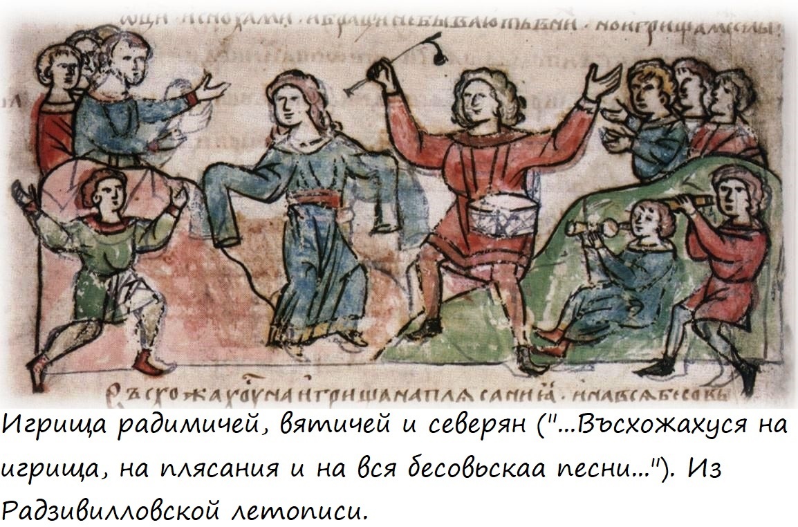 «Повесть временных лет» описывает вятичей и живших с ними по соседству радимичей и северян в дохристианскую эпоху как народы, жившие в лесу «подобно зверям», сквернословившие при отцах и невестках, употреблявших в пищу «все нечистое», похищавшие невест во время праздников и имевшие по нескольку жен. Понятно, что столь грубое описание вятичей летописец осуществил с точки зрения раньше других восточнославянских племен принявших христианскую веру и живших по строгим патриархальным традициям киевлян. Однако из него можно заключить, что у вятичей вследствие удаленности их территории от важных торговых путей очень долго сохранялись пережитки первобытнообщинного строя, и даже в хозяйстве важную роль играли первобытные элементы (собирательство, использование для жилья естественных природных укрытий). После объединения восточнославянских земель вокруг Киева и обращения в христианскую веру вятичи, привыкшие к первобытному равноправию, испытывавшие вследствие невысокой развитости хозяйства сильны
