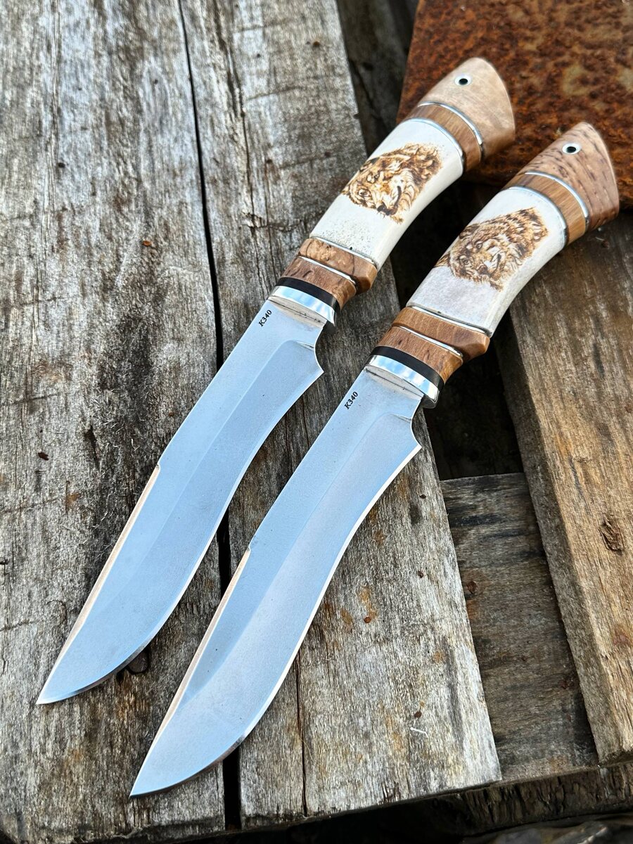 Ждёт своего хозяина вот такой красавец - нож Волк. Ножи из инструментальной стали К340 от компании Bohler Uddeholm обладают оптимальной для ножей твердостью (HRC 62), агрессивным резом, высокой коррозионной стойкостью, высокой ударопрочностью. На клинке чуть вогнутая линза от середины спусков, антибликовая обработка, фальшлезвие на передней части обуха, бритвенная заточка режущей кромки. Наборная радиусная рукоять из рога лося с художественной пирографией и кареьской берёзы. Цена ножа 12570 руб. Обычная цена 15100 руб. Можем изготовить формованные ножны из кожи растительного дубления (+ 8000 руб.) Для заказа писать на @Nazarklinokbot или по тел +79101343831, WhatsApp
