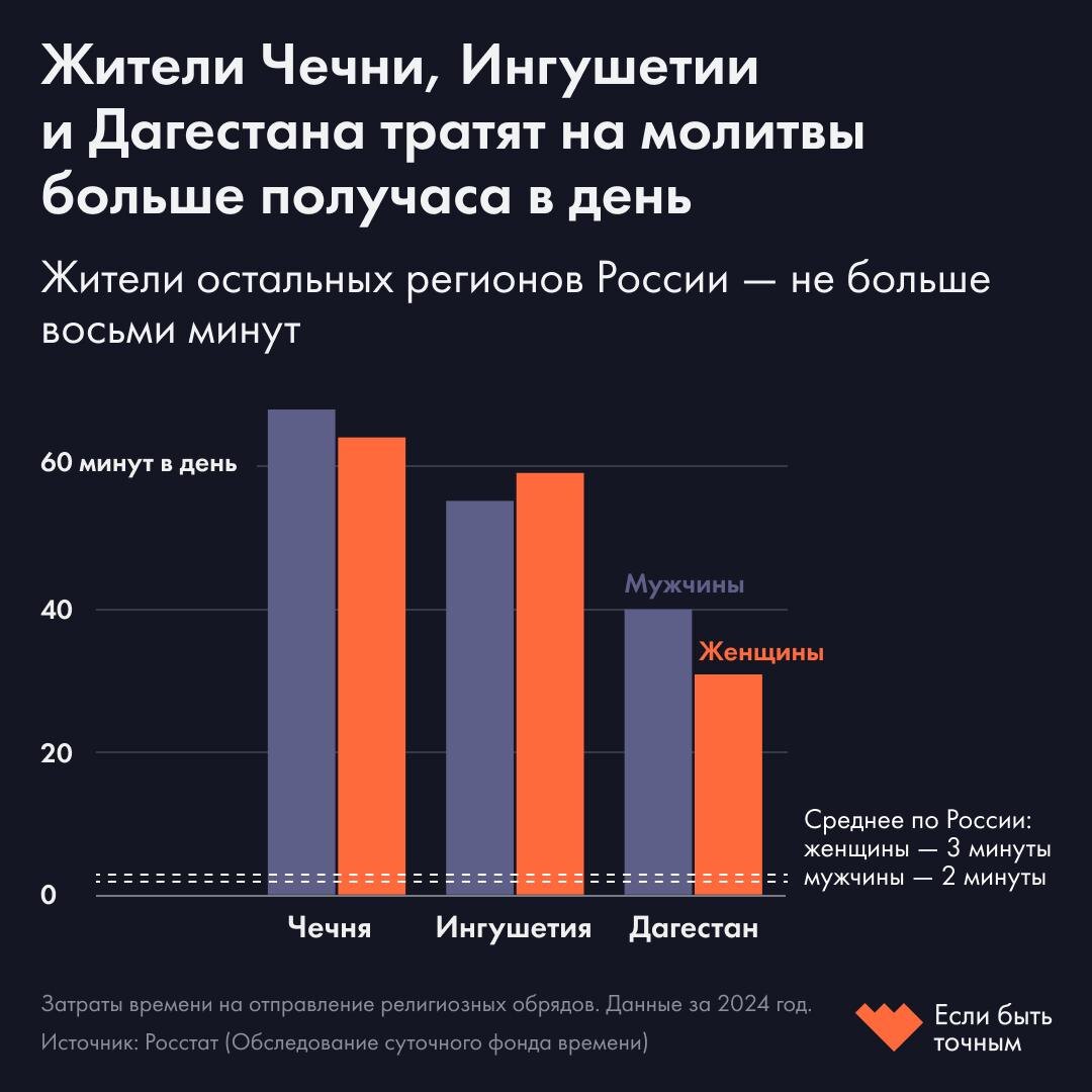 В среднем на религиозные обряды российский мужчина тратит две минуты в день, женщина — три. Больше всего на молитвы тратят жители Чечни, Дагестана и Ингушетии. Это следует из обследования суточного фонда времени Росстата за 2024 год, на которое обратил внимание «Если быть точным». При этом большинство россиян (66%) считают себя верующими людьми, следует из всероссийского опроса населения Центра исследований гражданского общества и некоммерческого сектора НИУ ВШЭ. Большинство (56%) относят себя к православным, 6% — к мусульманам. Не считают себя верующими 31%. 🔸Больше всего времени на религиозные обряды тратят на Кавказе В Чечне мужчины посвящают религиозным практикам в среднем 1 час 8 минут в день, женщины — 1 час 4 минуты. В Ингушетии на молитвы уходит 59 минут у женщин и 55 минут у мужчин. В Дагестане мужчины тратят 40 минут, женщины — 31 минуту. Такие различия могут быть связаны с тем, что в республиках Северного Кавказа самая высокая доля верующих. Лишь 11% жителей этих регионов н