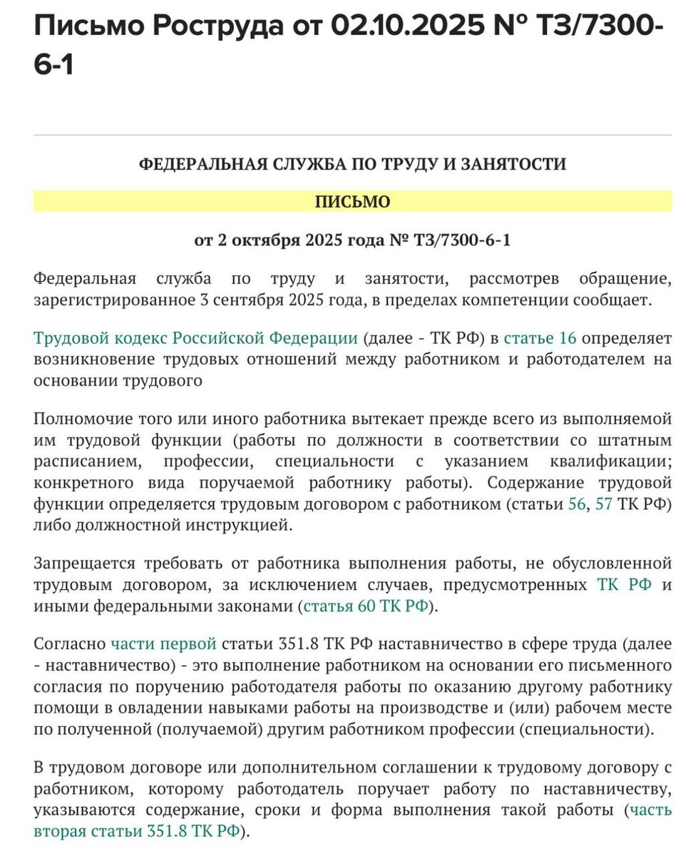 Роструд разъяснил правила оплаты наставничества ♥️Ведомство разделило ситуации, когда наставничество — постоянная обязанность, которая включает оплату за эту работу, и когда оно требует отдельного поручения, согласия работника и дополнительной выплаты. ♥️если обязанность по обучению прописана в трудовом договоре или должностной инструкции, то зарплата уже включает оплату за эту работу, а если наставничество — дополнительная работа, ее нужно оформить и оплачивать отдельно. ♥️Содержание, объем, сроки, форма работы и размер доплаты указывают в трудовом договоре либо дополнительном соглашении к нему. При этом не имеет значения, утвердил работодатель выплаты наставникам локальным актом или нет. ♥️Зарплату он должен получать с учетом выполнения таких обязанностей. В этом случае на работника не распространяются особенности регулирования труда наставников. Если же сотруднику поручают работу по наставничеству, то ее нужно оплачивать с учетом содержания и объема обязанностей. ♥️Работник в