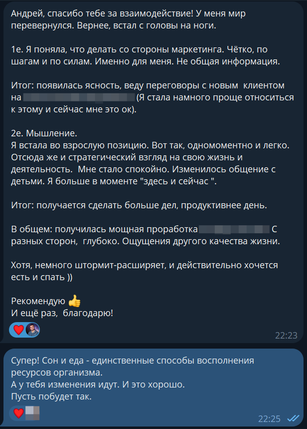 (Отзыв внизу статьи) Как психолог, она к маркетингу относилась скептически. Методы из советов не срабатывали, продажи вызывали дискомфорт. Искала, где найти «свой маркетинг». Оказалось, дело не в том, чтобы знать больше, а в том, чтобы расчистить немного эмоциональных проблем и делать то, что подходит лично тебе. Страхи, тревоги, ощущение, что продвижение — это не про тебя. Т. е., как обычно, начали не с продукта или каналов, а с состояния. Иначе бы одного толкового курса по маркетингу и продажам хватало бы любому психологу. Поэтому эмоции — самый важный этап. Пока не разберёшься с ними, стратегий не увидишь. И вот главное изменение состояния — отточили взрослую позицию. После эмоционального разбора наконец появилась ясность, куда двигаться. Именно здесь закладывалась персональная стратегия: какой формат продукта лучше откликнется, как общаться с клиентами. Стало понятно, какие форматы и каналы сработают для конкретного человека, а не просто из общих рекомендаций. В итоге получили чётк