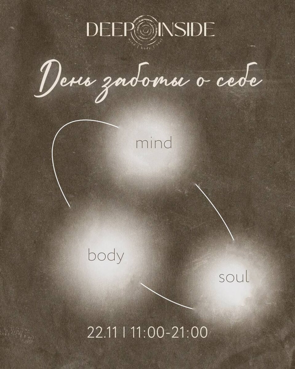 Только обсудила с психологом, как мне подружить чувства, разум и тело (и что, возможно, именно в раздоре между ними корень моей бессонницы), как прилетела информация про целый день заботы о себе в одной из моих любимых московских студий йоги Deep Inside. Я свой личный челлендж бережного отношения к себе запустила 20 сентября, как раз начала в Deep Inside. И хотя не про все активности рассказывала тут, могу утверждать, что у меня случились одновременно марафон йоги и марафон работы с психологом и гипнотерапевтом. Эффект я вижу глобальный, и он выражается не только в том, что в 50 я могу выставить фото в купальнике, как минимум гимнастическом (в 17-18 я так стеснялась своего тела, что не помню чем прикрывалась, перебегая из женской раздевалки в спортзал на художественную гимнастику, которая на первом курсе журфака досталась мне в виде физкультуры. А физкультура на журфаке МГУ как минимум в 90-е была главным предметом. Про наших стройнейших бабушек-тренерш надо писать книги по биохакин