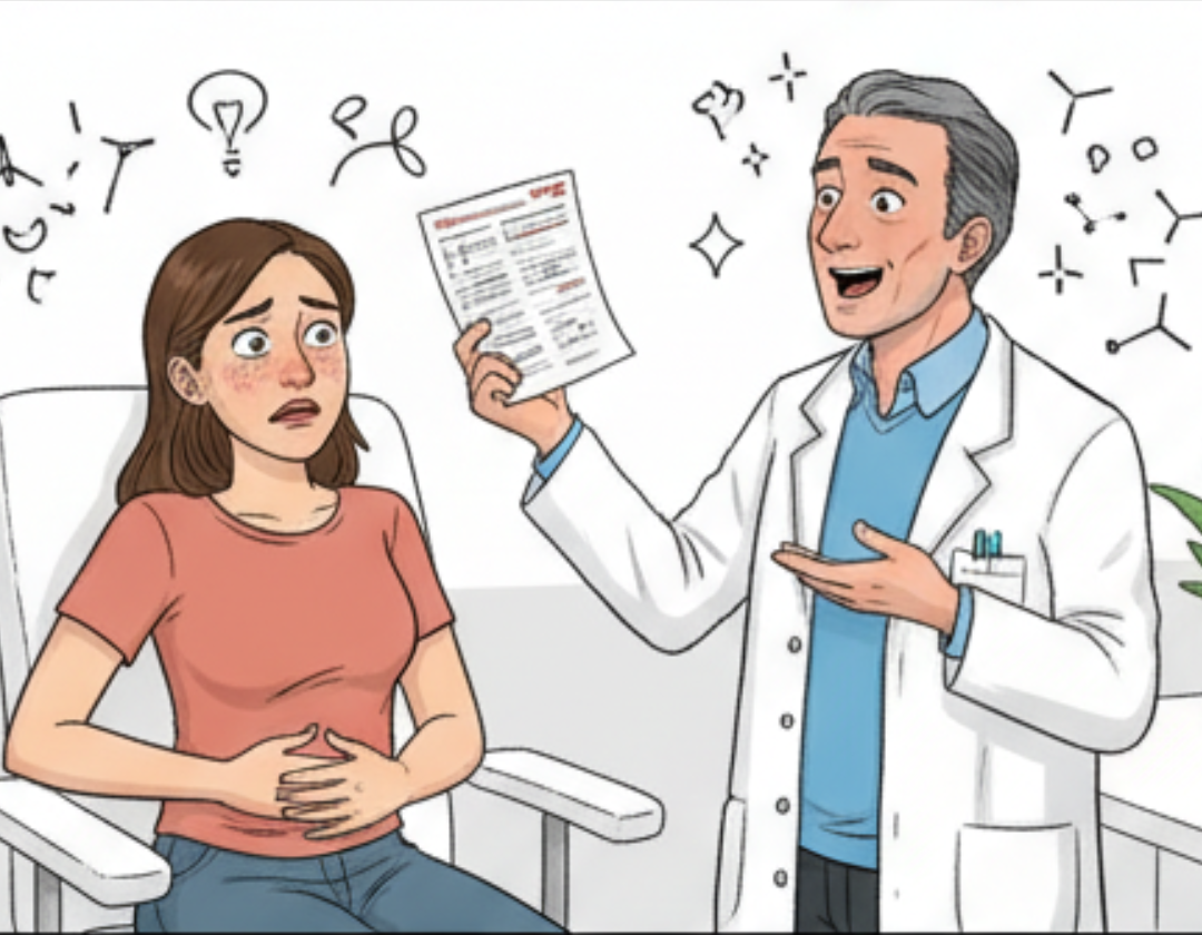 Приём начинается с того, что он обрушивается на меня со своими медицинскими терминами, объясняя каждую строчку моего анализа крови. Создаётся впечатление, что он сам наслаждается своей компетентностью и значимостью. А я, с полным мочевым пузырём и глазами, готовыми вылезти на лоб, жду лишь одного — чтобы он наконец начал обследование и отпустил меня в туалет.