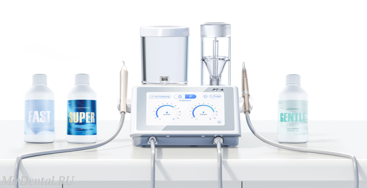 Автономные скалеры — это отдельные приборы со своим резервуаром для воды и системой управления. Их можно перекатывать между кабинетами. Один прибор может работать на несколько процедурных. Особенно удобно для клиник, где гигиенист работает в разных кабинетах по графику.
