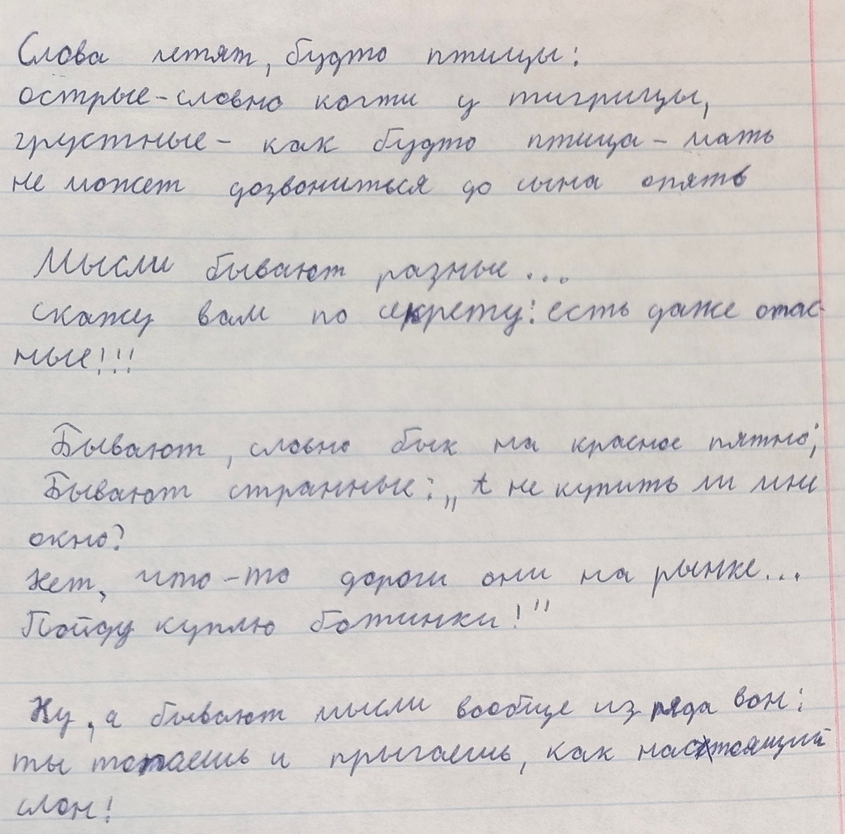 Среди всяких бумаг нашла Андрюшино стихотворение, написанное два-три года назад, точно не помню ни я, ни Анюта. Слова летят, будто птицы: острые - словно когти у тигрицы, грустные - как будто птица-мать не может дозвониться до сына опять. Мысли бывают разные... Скажу вам по секрету: есть даже опасные!!! Бывают, словно бык на красное пятно; Бывают странные: "А не купить ли мне окно? Нет, что-то дороги они на рынке... Пойду куплю ботинки!" Ну, а бывают мысли вообще из ряда вон: Ты топаешь и прыгаешь, как настоящий слон! *** Как-то на своём уроке в приюте я предложила ребятам-подросткам написать слова к Всевышнему - анонимно, без подписи, просто как обращение к Нему, во Вселенную. Погода была пасмурная. Один мальчик сказал: "А там, за серым небом, есть солнце?" Честно ответила, что не знаю. Но надеюсь... Вопрос-то был метафоричный. Сохранилось в одной рабочей папке несколько обращений ребят. Некоторые - прямо-таки на клочках бумаги, хотя чистые листы для всех лежали на моём столе.