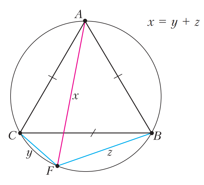 7. "Около равностороннего треугольника ABC описана окружность, F – произвольная точка дуги BC, не содержащей вершину A. Докажите справедливость равенства x = y + z."