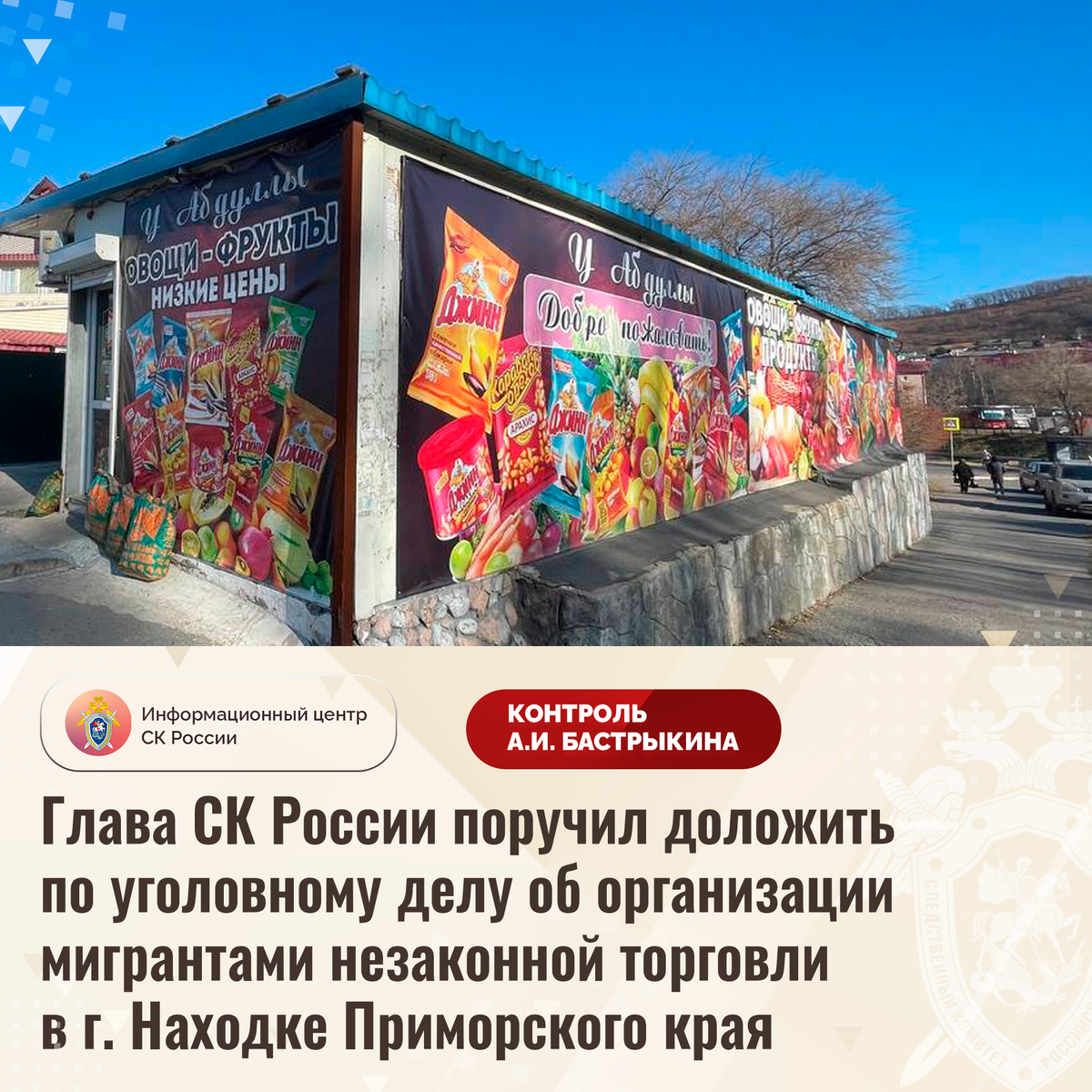Глава СК России поручил доложить по уголовному делу об организации мигрантами незаконной торговли в г. Находке Приморского края В телеграм-канале сообщается об организации мигрантами незаконной предпринимательской деятельности в городе Находке Приморского края. Ранее иностранные граждане на предоставленном администрацией земельном участке самовольно возвели павильон с нарушением норм, в связи с чем соглашение с ними было расторгнуто, объект исключен из соответствующей схемы размещения торговых точек. Несмотря на это, фигуранты продолжают реализовывать продукты питания, мер к демонтажу строения не принимается. В СУ СК России по Приморскому краю возбуждено уголовное дело. Председатель Следственного комитета Российской Федерации Александр Иванович Бастрыкин поручил руководителю СУ СК России по Приморскому краю Эдуарду Анатольевичу Трубчику представить доклад об установленных в ходе первоначальных следственных действий обстоятельствах, а по завершении расследования – о его результатах. Ис