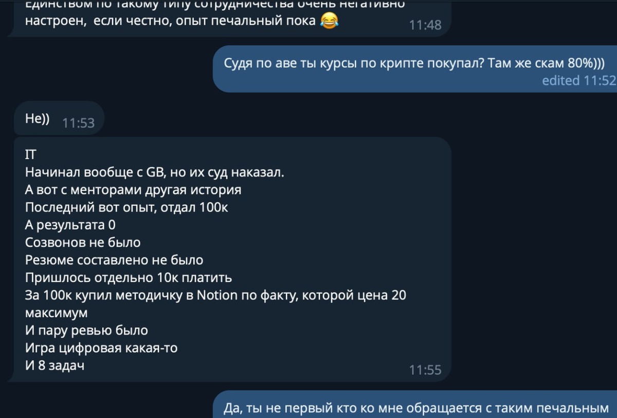 ШОК. МЕНТОР ЗАСКАМИЛ СВОЕГО УЧЕНИКА НА 100К Ко мне пришел студент с последней надеждой. И первое, что он сказал "меня кинули" и рассказал историю, от которой у меня свело зубы 😤 Человек хотел войти в бэкенд. Купил обучение в GB. Получил НОЛЬ результата. Никакой поддержки. Дошло до того, что он судился с курсоделами. Судился, чтобы вернуть хотя бы часть потраченной надежды. После суда он подумал: «Мне нужен живой наставник. Реальный человек». Нашёл “ментора” 🤡 И этот ментор взял с него 100.000₽, и выдал ему… методичку в Notion. Без созвонов. Без разбора. Без сопровождения. Без обучения вообще. А потом знаете что? ЭТОТ МЕНТОР ЗАСТАВИЛ ЕГО ПЛАТИТЬ 10К ЗА РЕЗЮМЕ. И студент заплатил, думал хоть на этом вывезет и дойдет до оффера, но увы. И в этот момент внутри у меня поднялось то чувство, которое появляется только когда видишь реальную, невыдуманную несправедливость. Потому что вопрос, который встал у меня в голове — он опасный: Сколько таких “скамеров-менторов” сидит в Telegram?