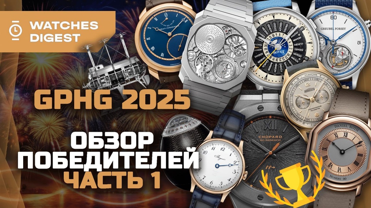 GPHG 2025. ОБЗОР ПОБЕДИТЕЛЕЙ. ЧАСТЬ 1 #новости_WD 13 ноября были подведены итоги GPHG, другим словами — Часового Оскара. Сразу после окончания церемонии награждения мы назвали список победителей, а теперь рассказываем о них подробнее. В сегодняшнем видео — обладатель Золотой стрелки Breguet, выигравшие приз Открытие года часы Антона Суханова, а также победители в восьми номинациях, которые условно можно назвать «про сложность»: — Aiguille d’Or: Breguet Classique Souscription 2025; — Horological Revelation Prize: «Петербургский пасхальный турбийон» Антона Суханова; — Mechanical Exception: Greubel Forsey Nano Foudroyante; — Men’s Complication: Bovet 1822 Récital 30; — Tourbillon: Bvlgari Octo Finissimo Ultra Tourbillon; — Chronograph: Angelus Chronographe Télémètre Yellow Gold; — Sports: Chopard Alpine Eagle 41 SL Cadence 8HF; — Time Only: Daniel Roth Extra Plat Rose Gold; — Men’s: Urban Jürgensen UJ-2: Double wheel natural escapement; — Mechanical Clock: L'Epée 1839 X MB&F Albatross.
