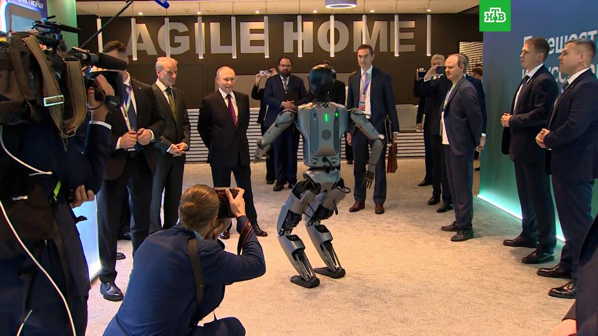 [ Смотреть видео на сайте НТВ ] Владимиру Путину понравился танец робота «Сбера». Российский лидер осмотрел экспозицию на выставке «Сбера». Там главе государстве представили человекоподобного робота Грина. Отечественный андроид попросил включить его любимый трек и исполнил танцевальные движения. «Очень красиво, спасибо», — поблагодарил Путин. Глава государства примет участие в пленарном заседании 10-й конференции «Путешествие в мир искусственного интеллекта» «Сбера». Трансляция мероприятия будет вестись на сайте НТВ.Ru. [ Смотреть видео на сайте НТВ ]
