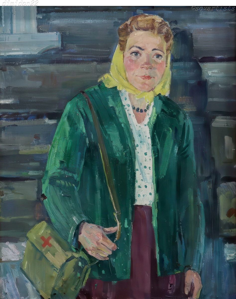 Силин Александр Семенович (22.06.1921, Чудская Рудница Псковской области - 15.07.2010, Псков). «Портрет фельдшера колхоза им. А. Невского - А. Терентьевой». 1972 год. Холст, масло; 82 х 75 см.; (Псковский государственный объединенный историко-архитектурный и художественный музей-заповедник).