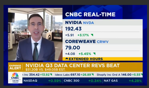 NVIDIA (NVDA) опубликовала отчет за третий финансовый квартал 2026 года и показала результаты, превзошедшие ожидания аналитиков как по выручке, так и по прибыли: Структура выручки: Реакция рынка: акции Nvidia выросли на фоне отчёта и позитивного guidance. В обзоре CNBC подчёркивается устойчивый спрос на GPU для AI, огромные заказы от Google, Microsoft, Amazon и других крупнейших компаний сектора. Отчет подтверждает лидерство NVIDIA на рынке AI-ускорителей, а также выступает как индикатор общего состояния "ИИ-бума" на рынке. Что говорит CNBC Streem: Вывод: отчет NVIDIA превзошёл ожидания, а прогноз также был лучше рыночных оценок, что укрепило позиции компании как лидера рынка AI-чипов и драйвера роста технологического сектора.