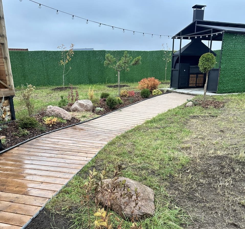 Обмотаем качель гирляндой, и будет еще одна зона для красивых фотографий. И уже весной планируется установка небольшой бани и полноценных качелей для детей.