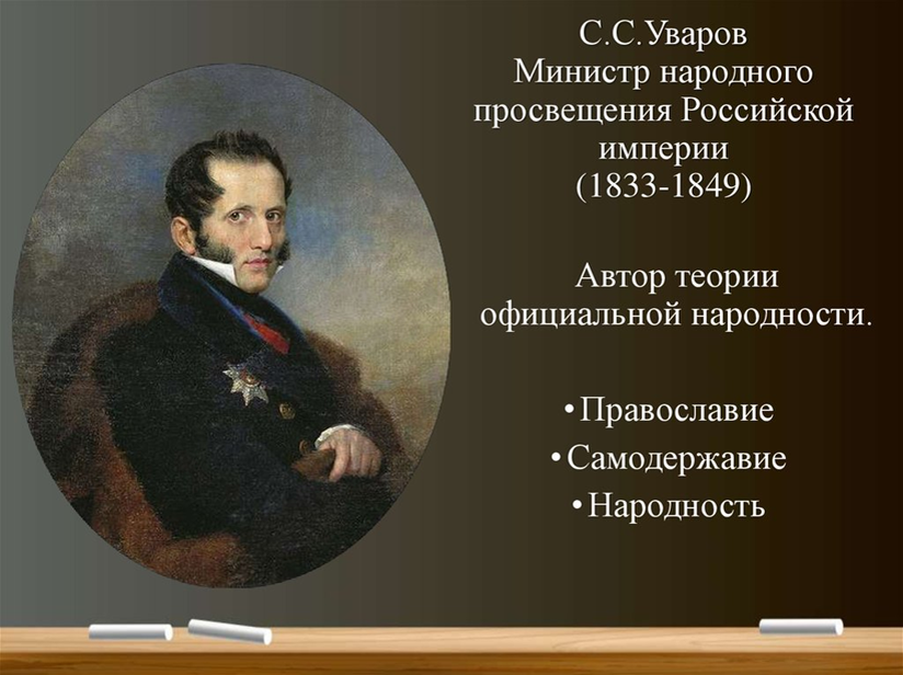 Теория официальной народности возникла в годы царствования Николая 1; эта теории основывалась на принципах православной веры, самодержавия и народности. Данная идеология впервые была озвучена в 1833 году графом Уваровым, который в Российской Империи занимал пост министра народного Просвещения. Правительство Николая 1 стремилось создать в России идеологию, которая отвечает потребностям государства. Реализацию этой идеи доверили С.С. Уварову, который 19 ноября 1833 года направил в адрес императора специальный доклад, под названием «О некоторых общих началах, могущих служить руководством при укреплении Министерства». В этом докладе он отмечал, что в России есть только три незыблемых понятия: · Самодержавие. Уваров искренне верил, что русский народ не разделяет таких понятий как «царь» и «страна». Для людей это все является единым, гарантирующим счастье, силу и славу. · Православие. Народ в России является религиозным, и почитает духовенство наравне с государственной властью. Религия можно