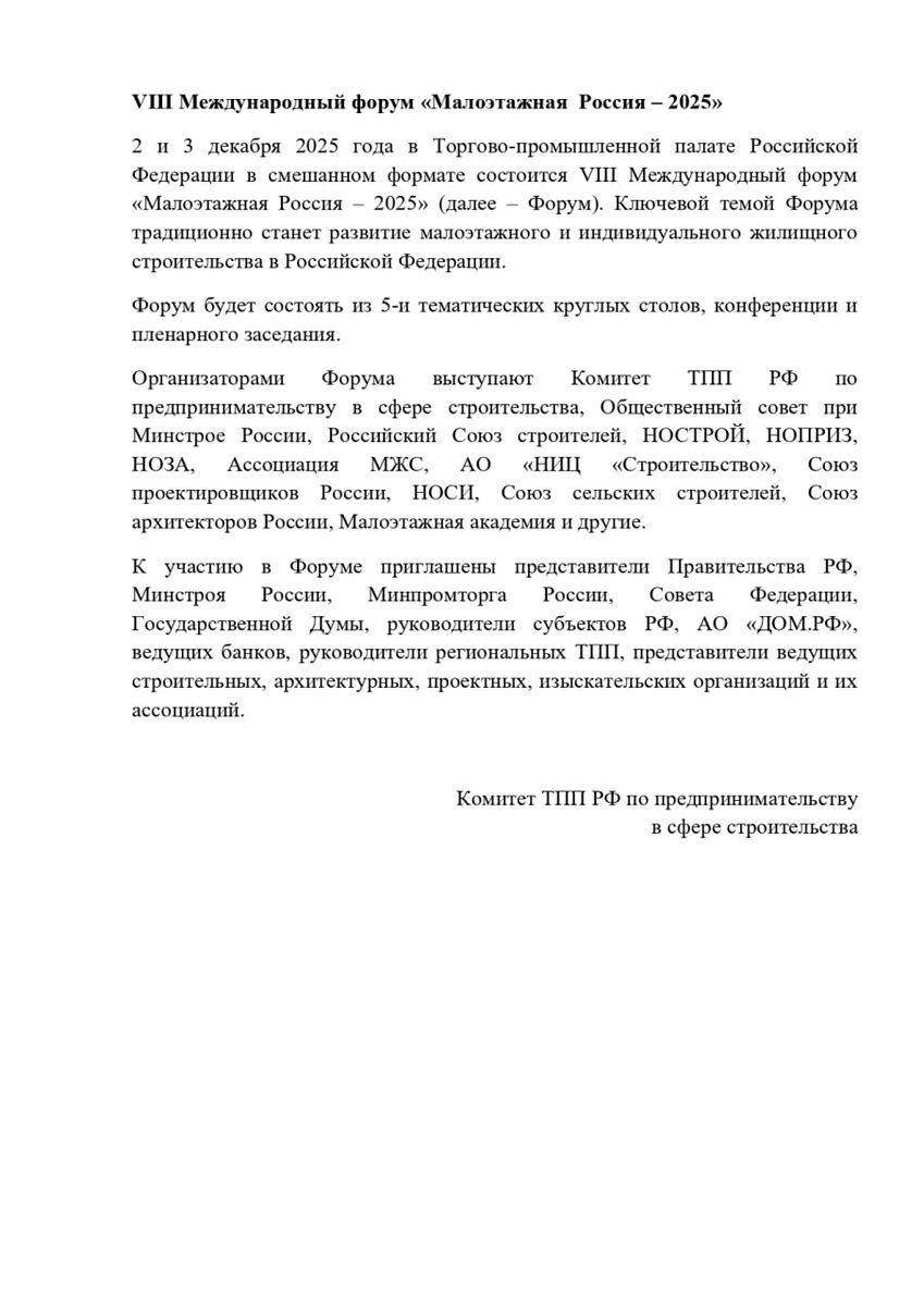 VIII Международный форум «Малоэтажная Россия – 2025» 2 и 3 декабря 2025 года в Торгово-промышленной палате Российской Федерации в смешанном формате состоится VIII Международный форум «Малоэтажная Россия – 2025» (далее – Форум). Ключевой темой Форума традиционно станет развитие малоэтажного и индивидуального жилищного строительства в Российской Федерации. Форум будет состоять из 5-и тематических круглых столов, конференции и пленарного заседания. Организаторами Форума выступают Комитет ТПП РФ по предпринимательству в сфере строительства, Общественный совет при Минстрое России, Российский Союз строителей, НОСТРОЙ, НОПРИЗ, НОЗА, Ассоциация МЖС, АО «НИЦ «Строительство», Союз проектировщиков России, НОСИ, Союз сельских строителей, Союз архитекторов России, Малоэтажная академия и другие. К участию в Форуме приглашены представители Правительства РФ, Минстроя России, Минпромторга России, Совета Федерации, Государственной Думы, руководители субъектов РФ, АО «ДОМ.РФ», ведущих банков, руководит