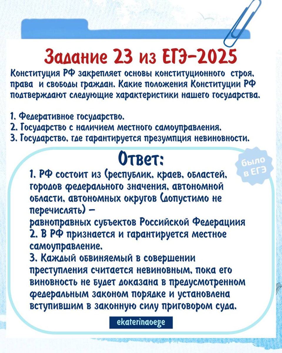 🔊🔊🔊🔊🔊Ловите 🤝 карточки с ответами для задания 🤝🤝из реального 🤝🤝🤝⬇️🤝👍🤝🤝 1️⃣ Конституция РФ закрепляет основы конституционного строя, права и свободы граждан. Какие положения Конституции РФ подтверждают следующие характеристики нашего государства. 1. Федеративное государство. 2. Государство с наличием местного самоуправления. 3. Государство, где гарантируется презумпция невиновности. ❗️Это задание попалось выпускникам на Кавказе. 2️⃣ Конституция РФ закрепляет основы конституционного строя, права и свободы граждан. Какие положения Конституции РФ подтверждают следующие характеристики нашего государства. 1. Федеративное государство. 2. Государство, в котором признаются и защищаются права и свободы человека и гражданина. 3. Государство, которое проводит социальную политику. ❗️Это задание попалось выпускникам Центральных регионов! 🖐👉👆 Каждое подтверждение должно быть сформулировано как распространённое предложение с опорой на конкретное положение Конституции РФ. Прав