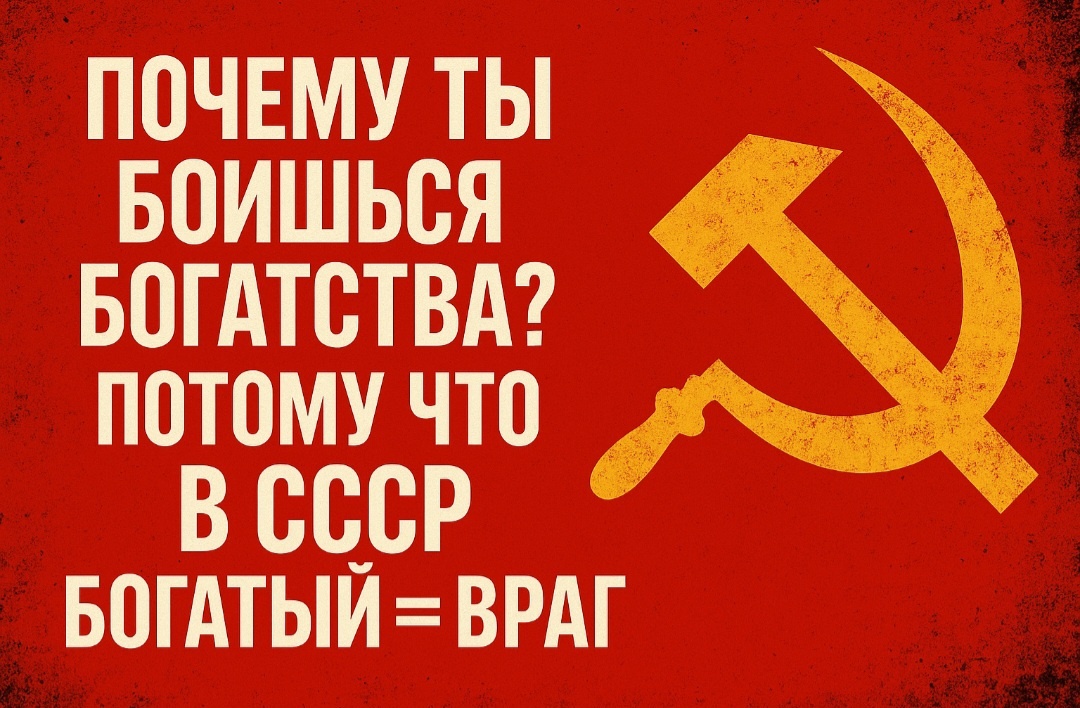 В СССР богатый = подозрительный. Там не бедняков боялись — на них и смотреть-то нечего было. Там с подозрением относились к тем, у кого что-то было: одежда получше, еда вкуснее, квартира почище. Любой достаток автоматически включал на тебе прожектор: «Откуда взял?» Богатый считался либо вором, либо спекулянтом, либо просто слишком самостоятельным. А самостоятельных система не любила. И это осталось в нас до сих пор. Мы сами не замечаем, как начинаем прятать свои успехи.