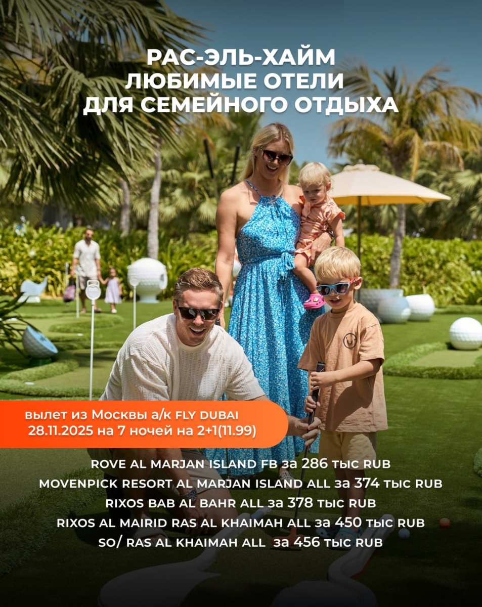Рас-эль-Хайм Любимые отели для семейного отдыха Спокойствие Песчаных Дюн и Изобильное Радушие Отелей На Все Включено вылет из Москвы а/к Fly Dubai 28.11.2025 на 7 ночей на 2+1(11.99) В Дубай прилетаем в 08:40(FZ966 ) , а вылетаем в 20:15(FZ965 ) , чтобы взять от отдыха все! Rove Al Marjan Island 3* FB (полный пансион) за 296 тыс RUB Новый отель, который завоевал любовь и популярность у многих наших туристов. Действительно качественный и классный отель, не смотрим, что уровень 3*. Rixos Bab Al Bahr 5* ALL (все включено) за 384 тыс RUB Популярный отель с обслуживанием по системе «все включено» состоит из 3 пирамидальных зданий. Для гостей — стильные номера, рестораны и бары, спа-центр, бассейны, ежедневные развлекательные программы, клубы для детей и подростков. Подойдет для семейного отдыха. Movenpick Resort Al Marjan Island 5* ALL (все включено) за 387 тыс RUB Стильный отель на побережье насыпного полуострова Маржан. Состоит из двух зданий, соединенных подвесным мостом и отдель