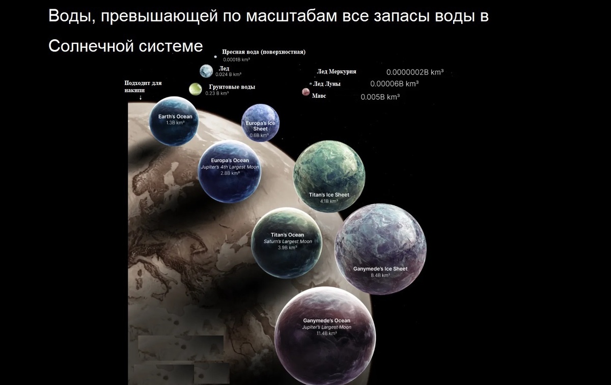 За пределами Земли вода во всех ее формах встречается гораздо в больших количествах, чем вы думаете. На нескольких ее спутниках Солнечной системы, есть океаны и запасы льда, которые значительно превосходят запасы нашей планеты. Спутники - Титан и Ганимед, скрывают многослойные океаны, запечатанные под толстым слоем льда, сформированного под давлением, структура которого настолько не похожа на земную, что обычная интуиция не в состоянии постичь, насколько огромны эти резервуары. Луна и Меркурий, которые часто считаются бесплодными, на самом деле сохраняют очаги замороженного материала в постоянной тени — ничтожно малые по сравнению с планетарными запасами, но поразительные, если учесть их подверженность беспощадному солнечному излучению. Объемы воды, были получены путём перевода опубликованных оценок массы или глубины в кубические километры с последующим переводом их в эквивалентные размеры сфер по стандартной геометрической формуле. Данные о Земле были получены из кадастра водных ресур