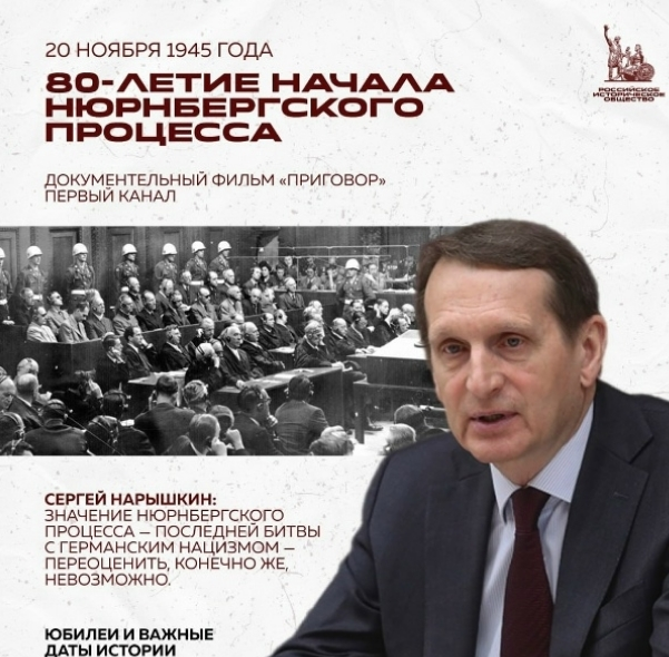 К 80-летию Нюрнбергского процесса Первый канал выпустил документальный фильм «Приговор», в котором продемонстрировал кадры кинолетописи «суда народов». В съемках принял участие Председатель Российского исторического общества Сергей Нарышкин: