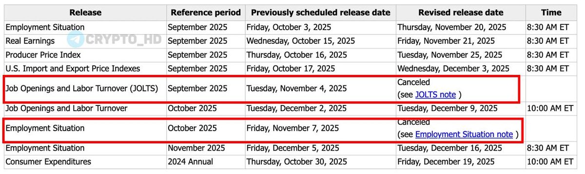 ❌🇺🇸 Теперь официально: Данные по рынку труда за октябрь – НЕ выйдут. Министерство труда США (BLS) обновило график публикации макроданных: ➠ Уровень безработицы и Nonfarm payrolls за октябрь – не опубликуют. ➠ Число открытых вакансий на рынке труда (JOLTS) за сентябрь – не опубликуют. ➠ Уровень безработицы и Nonfarm payrolls за ноябрь – опубликуют 16 декабря. ➠ Число открытых вакансий на рынке труда (JOLTS) за октябрь – опубликуют 9 декабря. Ранее: Белый дом Crypto Headlines