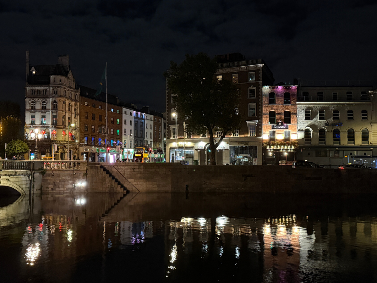 Чтобы дать представление, как выглядит вечерний Дублин, походил и сделал некоторое количество фотографий - это лучшее, что можно найти в центре города из видов в темноте. В огнях только отдельные здания, чтобы светились все фасады - такого нет вообще ни на одной улице.
