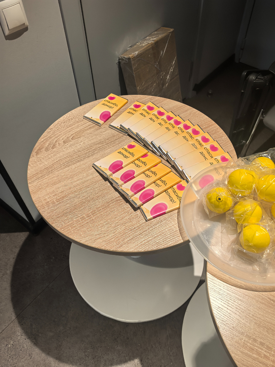 Что получает от этого компания? Ни-че-го. Я бы сказала даже теряет - ведь донору положены два дополнительных дня отпуска (оплачиваемого), для самой процедуры необходимо предоставить площадку, да и административно все организовать, людей оторвать от рабочего процесса. У нуа еще и подарки дают. Ну и компенсация питания донора (чуть больше тысячи рублей) - но это уже официальная государственная выплата, как мне известно. А сладкий чай и шоколадки - уже приятные мелочи.