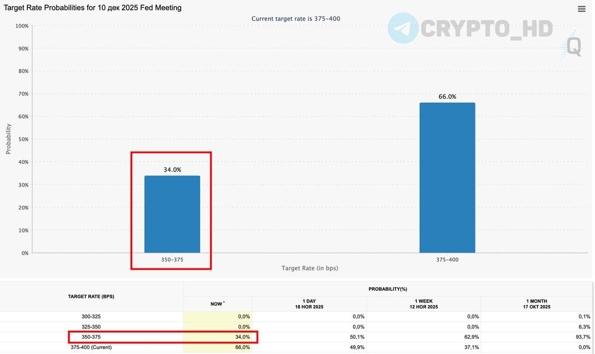 💥 FedWatch: Вероятность снижения ставки ФРС в декабре теперь составляет всего 34%. Crypto Headlines