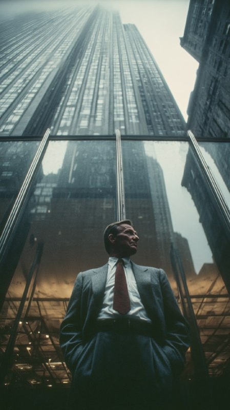 Представьте: Нью-Йорк 1980-х. Небоскрёб Манхэттена, снятый с улицы снизу вверх. За стеклом на 7 этаже — усталый бизнесмен в коричневом костюме и красном галстуке. Его задумчивый взгляд скользит по осеннему горизонту города. На стеклянных фасадах здания отражается городская суета, а внутри угадываются офисные детали: флуоресцентные лампы, строгие линии интерьера. Всё это — в мягких тонах с винтажной текстурой, будто кадр сделан на пленочный фотоаппарат Rolleiflex 1960-х.