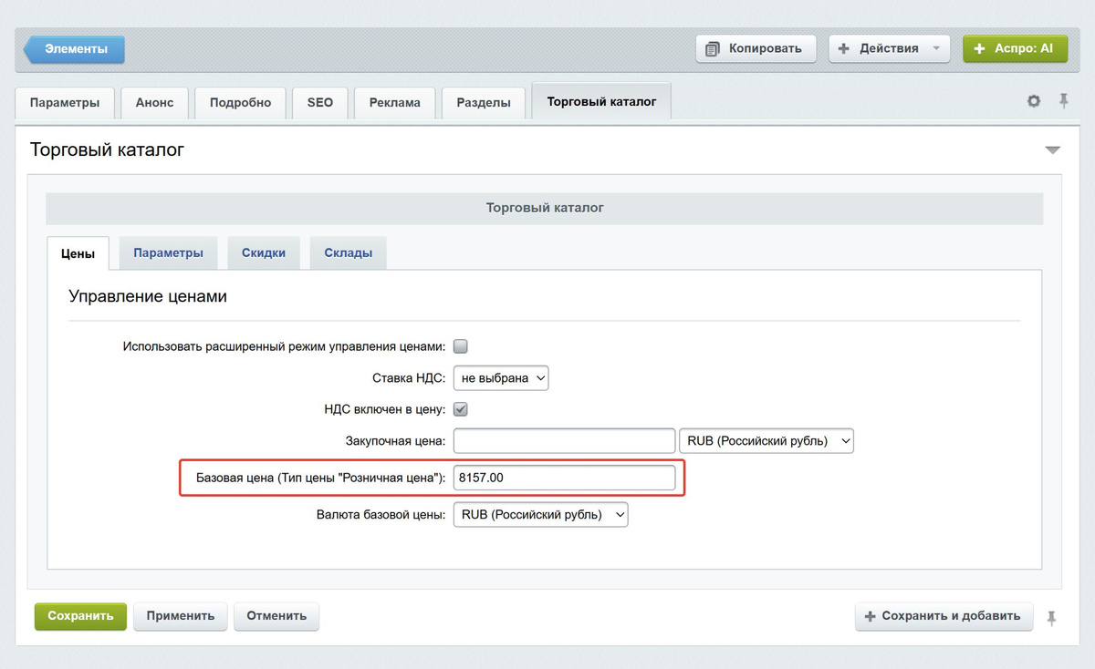 Копируем код «a0111e4a-1111-11ec-a111-b111baadd1aa», переходим на сайт в раздел Магазин / Настройки / Цены / Типы цен (/bitrix/admin/cat_group_admin.php), выбираем единственный тип цены и в режиме редактирования вставляем код в поле «Внешний код».