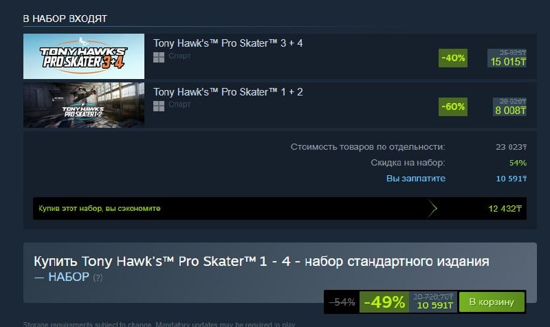 Цену исправили. В Steam сейчас по большой скидке продают ремейки Tony Hawk's Pro Skater — и при покупке бандла всех четырёх игр удивительно низкая цена. В казахстанском регионе: • 10 591 тенге — весь бандл • 15 015 тенге — только 3+4 • 8008 тенге — только 1+2. Выглядит как ошибочная цена, поэтому, возможно, стоит поторопиться.