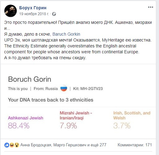 публикуем рассказ Боруха Горина о том, как, сдав по совету Нади анализ ДНК, он нашел американскую родню. Источник – журнал «Лехаим» и соцсети Боруха Горина Уже много лет я составляю наше семейное древо. Аккуратно опрашиваю всех старших родственников, фиксирую появление новых отростков. Увлекательное это дело. Интересно знать, откуда ты произошел, чьи гены в себе несешь. Древо росло, но без больших открытий. И тут я решил сдать на анализ свою ДНК, чтобы найти родню ультрасовременным способом. Через две недели результат был у меня на руках. А на сайте я стал изучать ближайшую родню. Четвертым в списке шел мой троюродный брат, о котором я и так все знаю. Тем интереснее были трое его опередивших. Кто эти люди, чьи гены ближе к моим, нежели гены человека, с которым я вырос?.. Американцы, о которых я ничегошеньки не знаю. Абсолютно незнакомые люди. Я написал им. Сьюзен ответила мне немедленно, еще двое – это ее сестра и кузен. Она тоже увлеченная исследовательница и обладает огромным запасо