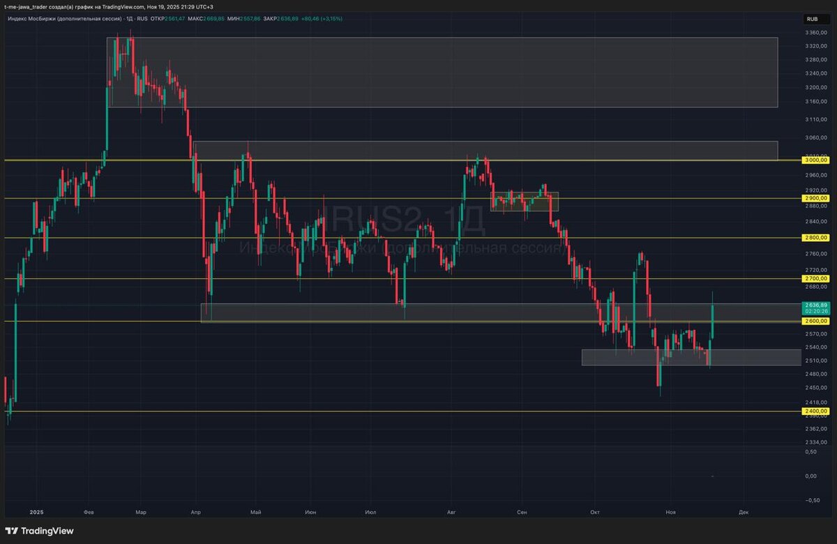 🗓 19 ноября 2025 Сегодня, на продолжении позитива Индекс Мосбиржи 🇷🇺 $IMOEXF $MXZ5 $MMZ5 уверенно прошел уровень 2600. К вечеру пошел небольшой откат. Рынок крайне сильно реагирует на новости, по прежнему любая новость может как привести к резкому откату, так и к сильному продолжению роста 🚀 Было бы красиво оттестировать уровень 2600 сверху вниз и продолжить рост. Будем наблюдать. В целом, мы сейчас на уровнях конца декабря прошлого года, когда начался резкий рост после заседания ЦБ. Сейчас ситуация и в геополитике и со ставкой гораздо лучше. Логично, что справедливые уровни сейчас гораздо выше текущих. Всем хорошей недели и профита! 👉 Подпишись на Jawa Trader