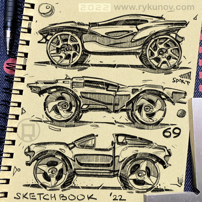 Меня зовут Сергей Рыкунов, и я дизайнер. В 2022 году я создал особый скетчбук — не просто сборник набросков, а визуальную летопись моего взгляда на автомобиль как на произведение инженерного искусства. В центре внимания — профиль. Вид сбоку раскрывает суть машины: её характер, динамику, внутреннюю энергию. На страницах моего блокнота оживают: Мои скетчи — на грани мультипликации и инженерной графики. Я сознательно балансирую между: Особое внимание — «говорящим» элементам: Рисую вручную: перьевая ручка, чернила, бумага. Никакой цифровой коррекции — только живой штрих, который сохраняет дыхание руки. Каждый лист — тщательно выстроенная композиция. Я планирую размещение: 3–4 автомобиля в профиль, объединённых общей темой или контрастом стилей. За год набирается около 50 страниц — это не просто коллекция, а эволюция взгляда, фиксация идей, которые рождаются на стыке наблюдения и фантазии. Мой визуальный словарь складывается из: Именно в процессе работы над автомобильными набросками
