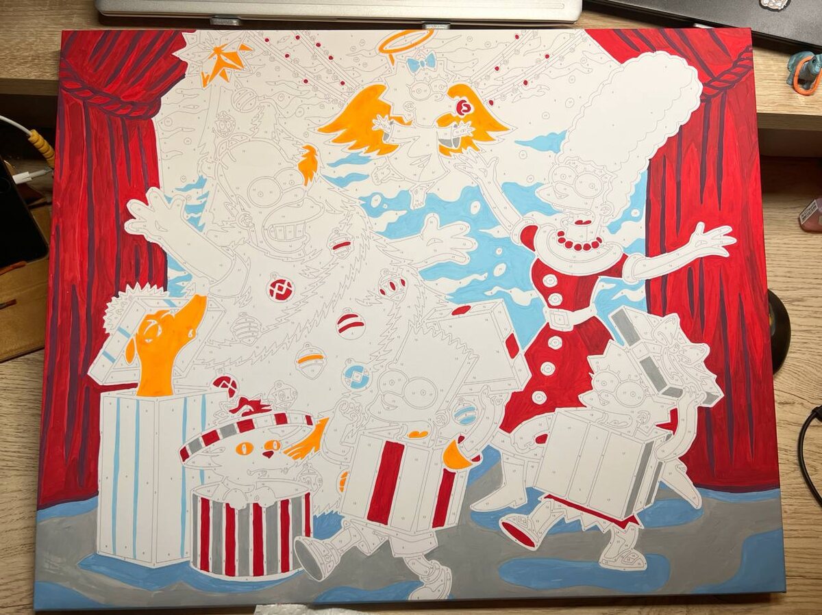 Мне нравится, как ложатся краски. Прямо в удовольствие сейчас процесс. Смотрю с грустью на других симпсонов, которых рисовала из-за красок 2 года с перерывами. Там я натурально плевалась и расстраивалась. Я тогда заплатила как-то очень дорого за ту картину, а качество оказалось 💩 Но картина хорошая получилась. Если хотите, покажу) #яхудожник😂 #картинапономерам