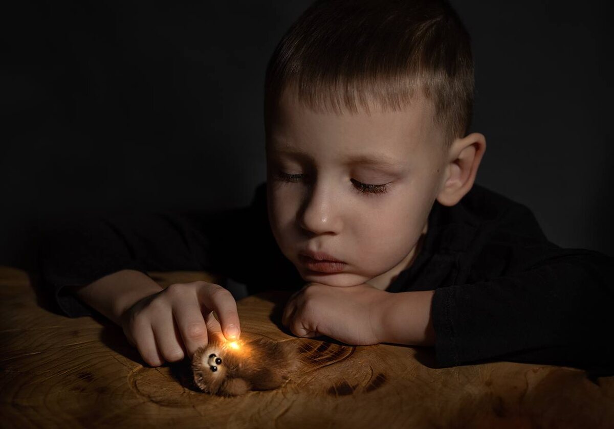 В мире, погруженном в тень, не осталось ничего, кроме тьмы и одиночества. Но когда мальчик находит зверька, его первое побуждение — не испугаться, а подарить ему часть своего тепла. В мире теней мальчик нашел того, кого можно согреть, он протягивает ему частичку солнца, жизни, тепла. И его детская доброта - это тот самый лучик на кончике пальца, который пытается оживить, согреть, спасти игрушечного зверька.