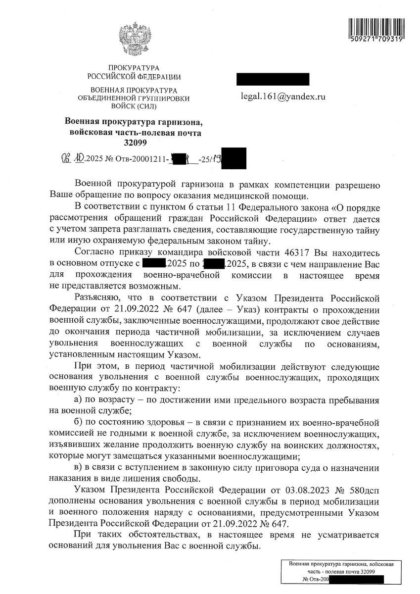 Изначально увольнение контрактника было затруднено из-за режима частичной мобилизации. Согласно Указу Президента РФ № 647 от 21.09.2022, все контракты о прохождении военной службы автоматически продлены до окончания периода мобилизации. Иными словами, уволиться по окончанию срока контракта тогда было невозможно, за исключением случаев, прямо предусмотренных законодательством (предельный возраст, состояние здоровья или вступление в силу приговора суда). Командование части сослалось на эти нормы и отказало иностранному военнослужащему в увольнении, что изначально получило поддержку надзорных органов.