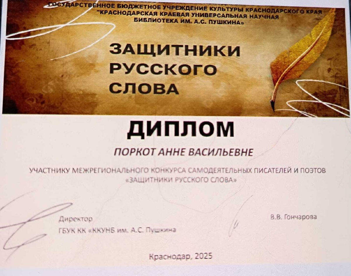 🌟 Поздравляем нашу читательницу Козетской сельской библиотеки Анну Васильевну Поркот! 🌟 Анна Васильевна успешно участвовала в конкурсе среди самодеятельных писателей и поэтов «Защитники Русского слова» и получила диплом! 🎉✍️ Поздравляем и желаем творческих успехов и вдохновения! 📚❤️