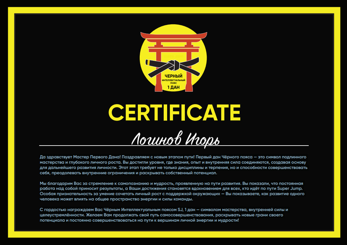 Получение Первого Дана Чёрного пояса — это не просто достижение, это настоящий праздник духа и упорства! Я чувствую, как в груди разгорается огонь — огонь стремления, который горел во мне все эти годы. Этот путь был полон испытаний и трудностей, но каждый шаг приближал меня к этой заветной цели. Я научился преодолевать свои страхи и сомнения, и теперь, когда я стою на этом новом этапе, понимаю, что это не просто конец, а начало чего-то великого! Я готов идти дальше, открывать новые горизонты и развивать свои навыки! Я хочу выразить свою безмерную благодарность каждому из вас! Ваша поддержка, ваши слова вдохновения — это то, что помогало мне в самые трудные моменты. Мы вместе пережили множество тренировок, побед и поражений, и именно это делает нашу команду такой особенной! С гордостью принимаю Чёрный Интеллектуальный пояс SJ 1 Дан! Это не просто символ Мастерства — это символ нашей общей работы и упорства! Я обещаю продолжать расти, развиваться и вдохновлять вас на новые свершения! Да