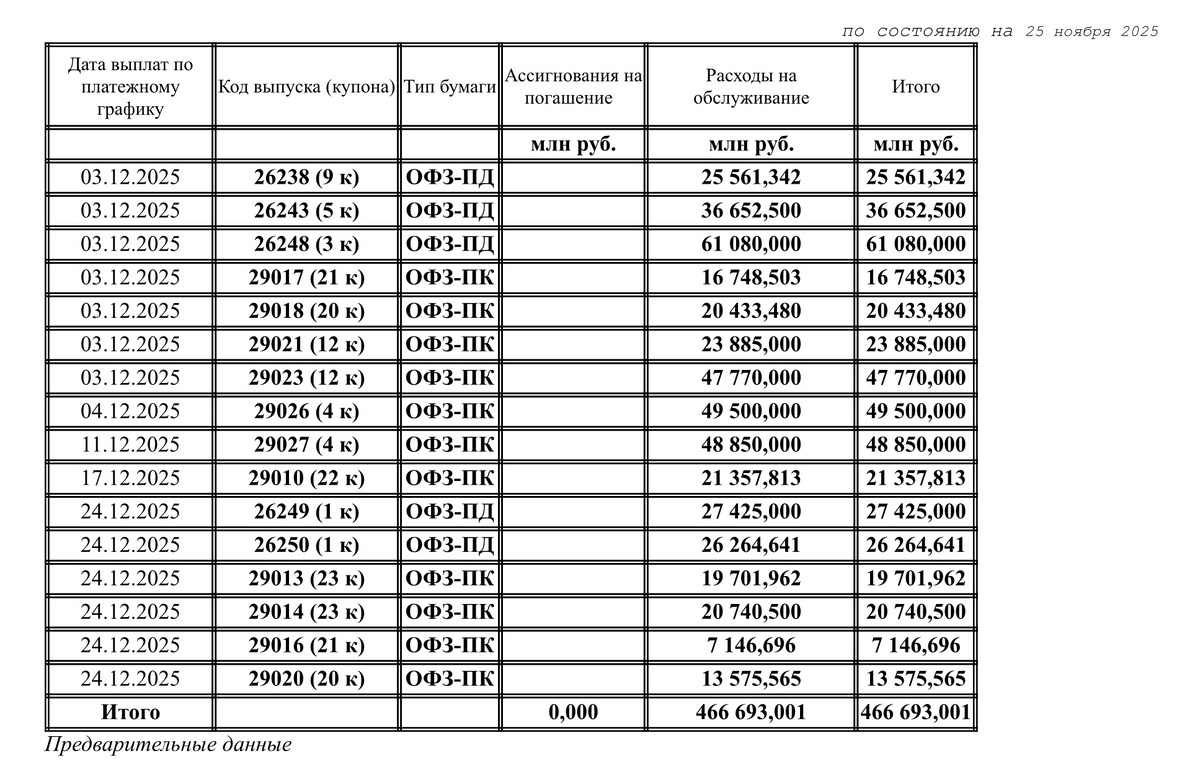 В декабре погашений облигаций не будет, но из-за больших купонных выплат, в основном по ОФЗ ПК, общие платежи окажутся существенными: 466 млрд руб , 6-е по размеру в году.