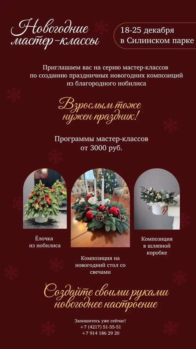 Новогодний мастер-класс в Силинском парке 🎄 Впервые, мы запускаем серию мастер-классов для взрослых! Даты проведения: 18–25 декабря ✨ Почему наш мастер-класс — это особенное событие: Профессиональное обучение от руководителя питомника САДКМС — эксперта с многолетним опытом Тёплая компания единомышленников, готовых поделиться идеями и вдохновением Вы создадите своими руками интерьерную композицию для новогоднего украшения дома 🎁 Вы можете создать: Роскошную ёлочку из премиального нобилиса Стильную композицию в элегантной шляпной коробке Праздничное украшение для новогоднего стола со свечами 🎉 Чему вы научитесь: Работать с нобилисом — благородным материалом, который сохраняет свежесть до 6 месяцев Создавать профессиональные композиции с учётом всех тонкостей флористики Правильно сочетать декоративные элементы для создания гармоничных композиций 💫 Специальное предложение: Групповые занятия (до 10 человек) — от 3000 ₽ Индивидуальные мастер-классы — 8500 ₽ Корпоративны
