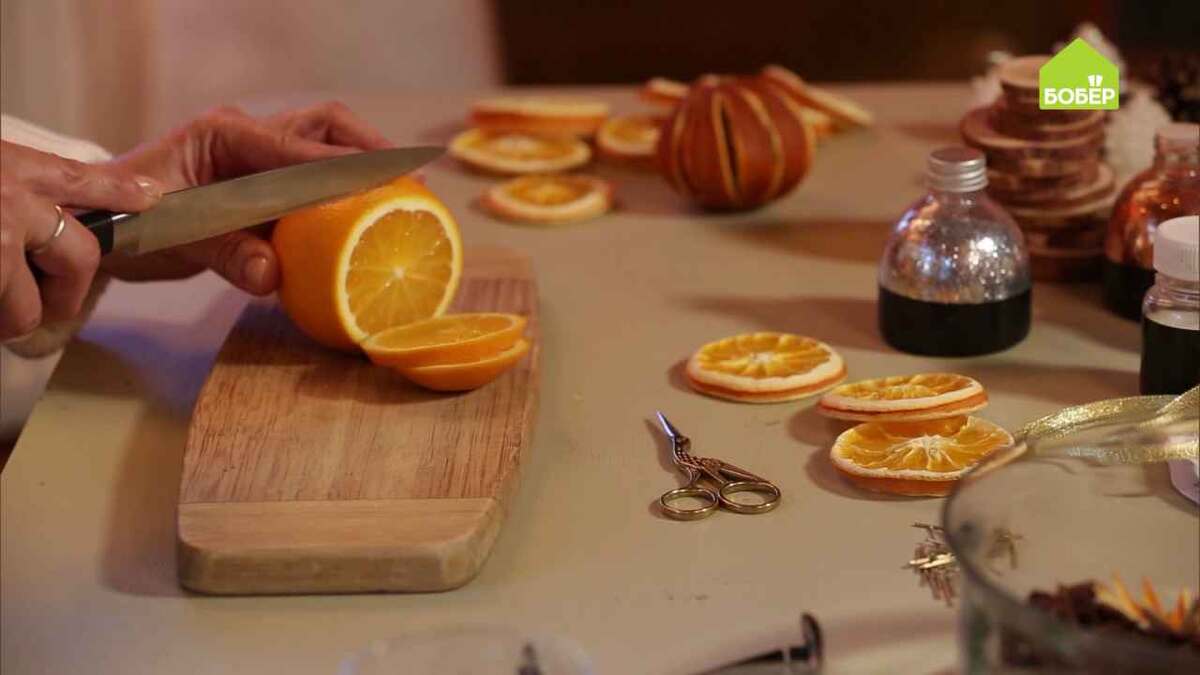 Чтобы красиво и оригинально нарядить ёлку, совершенно необязательно покупать эксклюзивные игрушки — их можно сделать своими руками из самых простых вещей! Творите и удивляйте! Нарежьте апельсин дольками толщиной 5 мм. Дольки апельсинов выложите на батарею: примерно через 4-5 дней они высохнут. Из апельсиновых корочек можно вырезать фигурки: аккуратно снимите с плода шкуру как можно более крупными фрагментами. Выложите шкурку на ровную поверхность, расправьте, прижмите доской и оставьте на несколько минут. При помощи ножниц вырежьте птичку. Выложите фигурку на батарею и прижмите стаканом, чтобы заготовка не утратила свою форму. Апельсиновая корочка высохнет за один день. Кроме того, из апельсина можно сделать ёлочный шарик. Для этого берите мелкие плоды с тонкой шкурой или лимоны и не используйте мандарины. При помощи ножа надрежьте шкурку апельсина на дольки, стараясь не задеть мякоть, верх и низ плода. Чем мельче дольки, тем красивее получится результат. В нескольких местах через раз